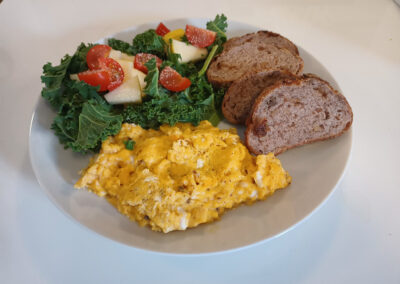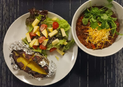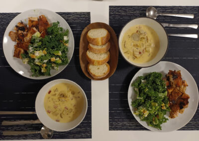 朝食は、卵料理、ベーコン、ヨーグルト、サラダ、パンなどを中心にした洋風スタイル。昼食や夕食には、チキンウィング、クラムチャウダー、ベイクドポテト、家庭的なカレー、ナン、簡単なアジア・中華系メニューなどを日替わりでゲストと一緒に準備します。