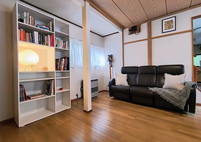 宿泊棟は3LDKの木造一戸建てで、最大5名までご宿泊可能。寝具は和式布団のみ、キッチン・バス・トイレ・Wi-Fi完備のシンプルな造りです。各部屋には自然光が差し込み、森を眺めながら静かに過ごせる環境で、暖房、空気清浄機、収納、デスクも備えており、ひとり時間や在宅ワークにも適しています。朝食や英会話などのアクティビティはこちらで行います。